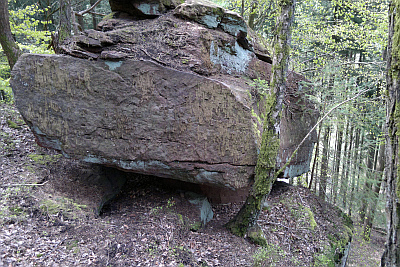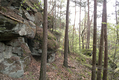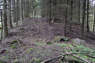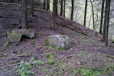 Beschreibung: Auf der westlichen Kuppe des langgezogenen Buntsandsteinrückens, 350 Meter östlich von Kaiserhammer,rund100 m, über dem Weiher, ist die höchste Stelle mit Wall und Graben geschützt. Als Überwachungsstation eines alten Handelsweges, dessen Spuren sich als Wegehohlungen im südlichen Hang und auf dem Bergrücken zeigen, hat diese Burg die günstigere Lage. Nur von der Ostseite war der Zugang möglich. Hier wurde als erstes Hindernis ein fast 6 Meter breiter Graben angelegt, der heute noch 0,80 Meter tief ist. Er beginnt am südlichen Steilhang, durchschneidet das Gelände etwa 15 m, erreicht dann die Bermenhöhe und setzt sich nach einer 0,80 Meter tiefen Stufe noch 5 Meter in nordwestlicher Richtung fort.