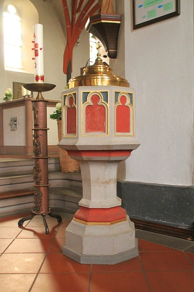 1815 Stützung des Turmes durch schwere diagonal gestellte Strebepfeiler. Hochaltar. Seitenaltäre mit geschnitzten Antependien und Retabel. Beichtstuhl und Kanzel aus der Kapelle Wachenforth.