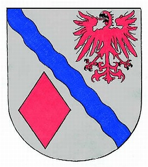 Im silbernen Schild eine schrägrechte blaue Wellenleiste. In den Heroldstücken links eine rote Raute und rechts ein roter Adler.