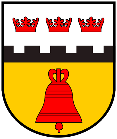 Die offizielle Beschreibung: Durch schwarze, oben gezinnte Leiste geteilt, oben in Silber drei rote Kronen balkenweise, unten in Gold eine rote Glocke.