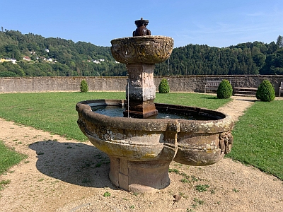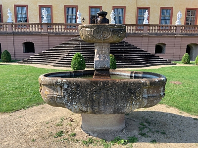 Runder Garten mit Terrasse von 1730. Erbaut vom Architekten Christian Kretschmar. 10 Rokokofiguren des Bildhauers Adam Ferdinand Tietz.