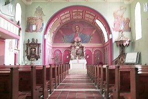 Barocker Saalbau von 1778. Westturm des 16. Jahrhundert Seitenaltäre und Kanzel aus dem Rokoko.