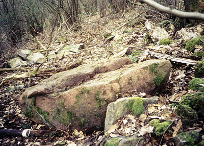 Der Stein liegt schwer zugänglich in einem Abhang umgeben von sehr viel Geröll und anderem Steinmaterial, das wohl im Zuge der Zusammenlegung von 1970 - 73 achtlos den Abhang hinunter geworfen wurde. Dabei sind offensichtlich von dem mächtigen Steinblock Steinbrocken abgesplittert. Im Umkreis von mehreren Metern sind sie zu finden. Obwohl ziemlich vermoost und mit Laub bedeckt, fallen die untypischen Sandsteine in dem Schieferhang auf. Die Fundstelle liegt mitten in dem einzigen auf der örtlichen Wanderkarte eingezeichneten Laubwaldareal an der engsten Stelle im Trittenheimer Moselbogen. Die nördliche Waldgrenze bildet gleichzeitig die Gemarkungsgrenze zwischen Trittenheim und Klüsserath.