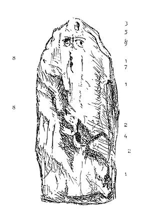 Des Weiteren lassen sich folgende Bearbeitungsspuren am Stein erkennen: Eingebohrte Augen mit Andeutungen von eingeschabten Augenbrauen, Spuren mehrerer Feinschliffe und ein zum Mund erweiterter Riss. Der Stein ist wahrscheinlich als Findling durch eiszeitliche Triften an die Mosel gekommen und durch die Steinmetze der Megalithvölker bearbeitet worden.