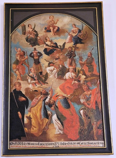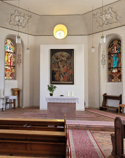 Dreiseitig geschlossener Saalbau von 1850-52. Ölgemälde der Vierzehn Nothelfer gestiftet 1768. [1]