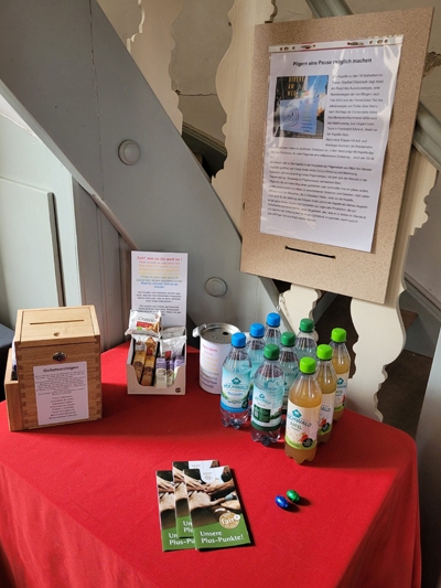 Im Inneren der Kapelle befindet sich eine Jakobsweg-Pilgerstation mit Pilgerstempel, Infomaterial und Erfrischungsgetränken. [3]