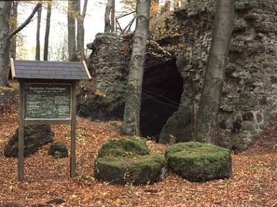 Das Baumaterial von Burg und Burghaus besteht aus Lavaschlacke, die direkt in der Mühlsteinhöhle geschlagen wurde3. So waren die Transportwege äußerst kurz. Als die Burg verfallen oder ausgeraubt worden war, hat man in der Höhle wieder Mühlsteine gebrochen. Jedenfalls berichtete Nose 1788, daß dort vier Mühlsteinbrüche in Betrieb waren. Heute noch erkennt man an manchen Stellen - auch im Deckengewölbe - Steinsetzungen und Mühlsteinablösungen. So wurde die Höhle immer größer, bis sie schließlich das heutige imponierende Ausmaß hatte. Doch hat nachgerutschtes Erdreich den ursprünglichen Höhlenboden bedeutend erhöht und auch einen Gang verschüttet, der mit großer Wahrscheinlichkeit links vom Eingang in den Fels hinein und vielleicht sogar zu einem Seitenausgang führte. Die Höhle hat heute eine Tiefe von 18 Metern und eine Gewölbehöhe von 10 Metern, so daß ein Einfamilienhaus leicht darin Platz hätte. Auf den Besucher macht das hohe Schlackengewölbe einen wunderlichen Eindruck, und auch der Blick aus der Höhle hinauf in die mit Buchengrün überkronte Felsschlucht macht den Betrachter nachdenklich. Es ist klar, daß sich um eine solche geheimnisvolle Örtlichkeit seit alters her Sagen gewoben haben. So meinen die einen, daß es einen unterirdischen Gang zur Kasselburg (bei Pelm) gebe, während eine andere Sage berichtet, daß der Nerother Kopf mit der Altburg (bei Schalkenmehren) in Verbindung stehe.