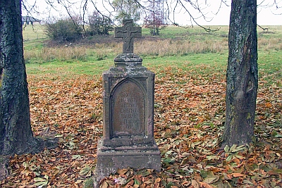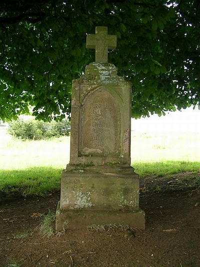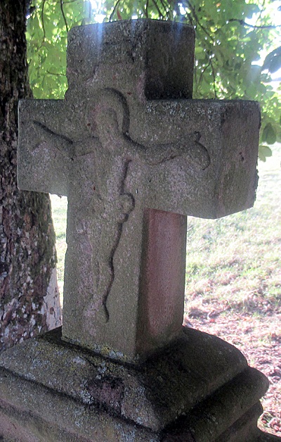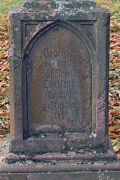 Zwischen Bäumen stehendes schlichtes Sandstein-Pfeilerkreuz des späten 19. Jahrhunderts. Der gestufte Pfeilersockel mit Inschrift in Spitzbogenblende, das kleine Abschlußkreuz mit einem handwerkich im Flachrelief herausgearbeiteten Korpus. [1]