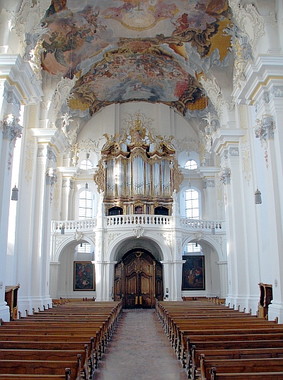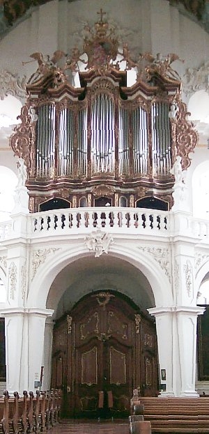 Neumann schuf mit dem Kircheninneren auch den Orgelprospekt nach einem Entwurf von Seitz und bezog diesen in das herrliche Gesamtbild mit ein, Nollet lieferte das dazugehörige Orgelwerk mit zwei Manualen und Pedal. Schon 1858/59 mußte dieses nach einer Renovierung 1823 durch Franz Stumm einem neuen Pfeifenwerk einschließlich Windladen von H.W. Breidenfeld weichen.