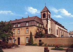 Seit 1894 Kloster der Weißen Väter. Die 1730 erbaute Kirche ist ein schlichter, gotisierender, dreiseitig geschlossener Saalbau. Vor der Westseite ein niedriger Turm von 1495. Die barocke Altarausstattung verbrannte 1944. Die an die Nordseite der Kirche angebauten Klostergebäude stammen von 1755. [3]