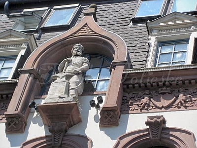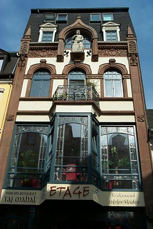 Dreigeschossiges, im Dach ausgebautes Wohn- und Geschäftshaus, nach Entwurf des Architekten Carl Dalmar von 1904 für den Eisenwarenhändler Peter Heil unter Miteinbeziehung älterer Kellerreste unter dem Vorderhaus erbaut, um 1982 saniert und umgebaut. Das schmale, enorm gestreckte Vorderhaus tritt mit einer originellen, sandstein- und eisengegliederten Putzfassade in Erscheinung. Für die Bauzeit ungewöhnlich und nur noch selten in der Altstadt nachweisbar ist die Ausbildung von zwei hohen Ladengeschossen, die die Wandflächen der Fassade durch eine eisengegliederte Verglasung nahezu völlig auflösen. Asymmetrische Einteilung des Parterres, erstes Obergeschoß mit mittlerem, balkonübergriffenem Glaserker. Das niedrigere Wohngeschoß im zweiten Stock setzt sich durch eine sandsteingegliederte Putzfläche ab. Über den drei Bogenfenstern die mit einem prächtigen Sandsteinfries verzierte Drempelzone. Sie wird in der Mitte unterbrochen von einer großen Kielbogennische mit der mannshohen und im Nazarenerstil gearbeiteten Sandsteinfigur eines Schmiedes. Er verweist wie die beiden, mit Zahnrad und Pleuel beziehungsweise Hammer und Zange verzierten, kleinen Wappenplaketten der Kantenlisenen auf den Gewerbezweig des Bauherrn. Beeinträchtigt wird der Bau durch das um ein zweites, neues Geschoß überhöhte Mansarddach, dessen untere Gauben erhalten blieben.