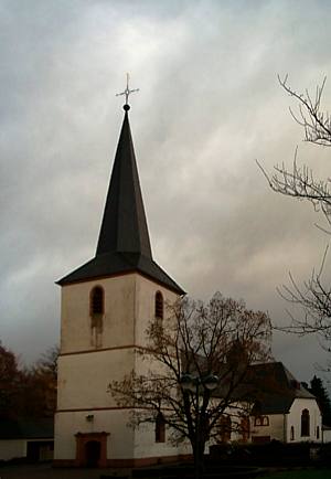 Am Südostrand des historischen Ortskerns im alten, teilweise zur Grünanlage umgestalteten Kirchhof gelegen. Ein spätgotischer, dreijochig eingewölbter Saal mit wohl gleich altem, ebenfalls gewölbtem Rechteckchor erhielt 1816 ff. einen dreigeschossigen Westturm als Ersatz für den alten und erfuhr 1928 nach Plänen des Trierer Dombaumeisters Julius Wirtz eine Erweiterung in der Weise, daß der vorhandene Chor abgetragen und im Anschluß an ein neu errichtetes Querhaus wiederaufgebaut wurde. Am Schiff getrennte Strebepfeiler und große Spitzbogenfenster, innen ein einfaches Netzgewölbe mit wappenbesetzten Rippen. Im Sinne der Reformarchitektur schlicht aber malerisch verschachtelt ist die Chorpartie von 1928 angelegt. Die Querhausarme schließen mit einer stumpfwinklig gebrochenen Stirnwand, deren Fenster einen verhalten expressionistischen Einfluß verraten. Der rekonstruierte spätgotische Chor wird fast in ganzer Höhe von Anbauten verdeckt.