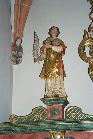 Innen betont ein zeltdachartiger Abschluß den zentralen Raumcharakter der Vierung. Im Chor wurde das spätgotische Sternrippengewölbe wieder eingebaut. Von der alten Ausstattung blieben der Hauptaltar mit seitlichen, 1728 datierten Trennwänden, ein Beichtstuhl des 18. Jh und ein achteckiger Taufstein erhalten.