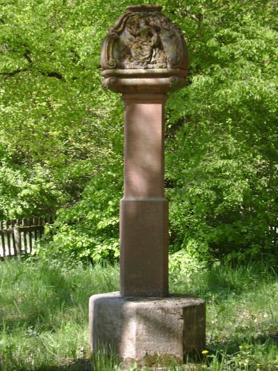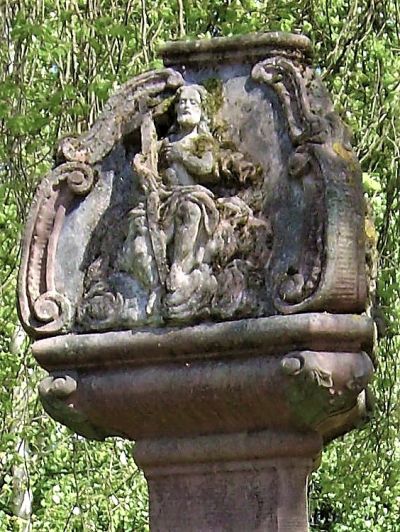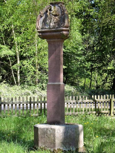 Hans Vogts sagt über das Dreifaltigkeitsbild: Dieses Bild ist aus rotem Sandstein geschaffen. Auf dreiseitigem Pfeiler ein Aufsatz mit drei Rokokokartuschen, deren jede in Symbolen eine der göttlichen Personen darstellt; aus der Mitte des 18. Jahrhunderts. [1]