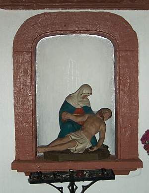 Die Kapelle ist viereckig und hat die Maße 4 x 3,50 Meter. Auf dem dicken Mauerwerk ruht ein Walmdach mit einem Kreuz auf der Mitte. Im Inneren finden wir die Darstellungen der Schmerzhaften Mutter, des heiligen Josef mit dem Kind und des heiligen Antonius mit dem Kind. In der Rückwand über der Pietà ist ein Sandsteinrelief eingelassen, das den heiligen Hubertus darstellt. Der Heilige kniet betend auf dem Boden, hinter ihm kommt sein Pferd, auf der anderen Seite steht ein Hirsch. Drei Hunde springen herum. Hubertus als Patron der Jäger passt gut in unsere waldreiche Gegend. Man fragt sich beim Anblick der Kapelle: Warum heißt sie eigentlich Markusbildchen? Von einer Darstellung des heiligen Markus oder seinem Symbol, dem Löwen, ist nichts zu sehen.