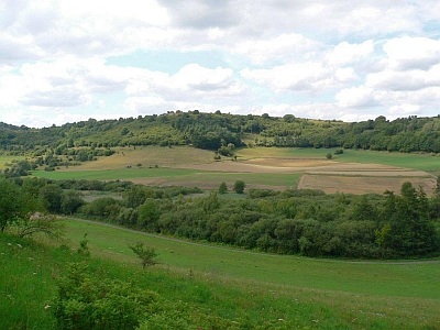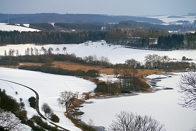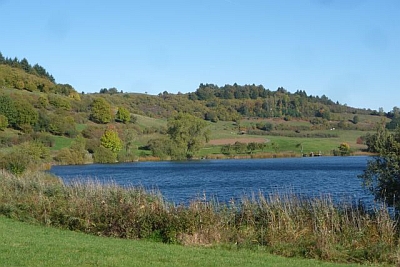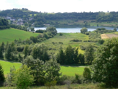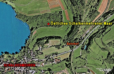 Östlich des Schalkenmehrener Maares, schließen sich zwei weitere Maare an. Die grüne Fläche mit Bäumen und Hecken bewachsen, ist das verlandete Maar, ein Refugium für Flora und Vogelwelt. Es ist im Laufe der Zeit verlandet und zum Moor geworden. Dahinter, an der Mulde erkennbar, ist ein weiteres Maar. Es ist heute eine fruchtbare landwirtschaftliche Fläche.