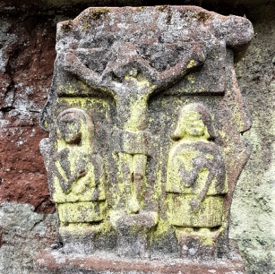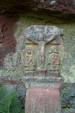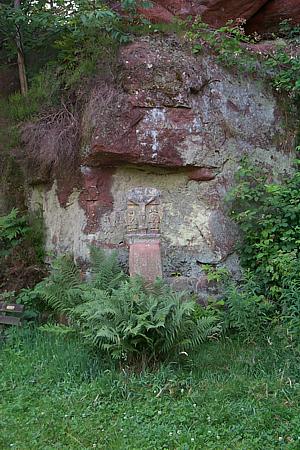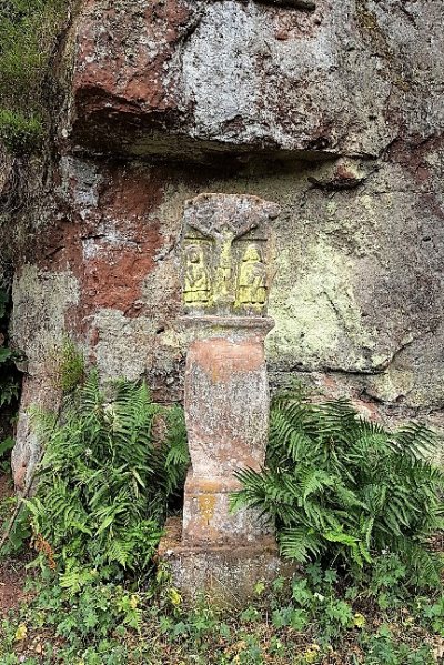 Schaftkreuzh südlich der Herrenmühle bei einer Talverzweigung. Schaftkreuz unter dem steil abfallenden Felssporn der Altburg. Handwerkliches Kreuzigungsrelief des 18. Jahrhunderts auf Balusterschaft. [1]