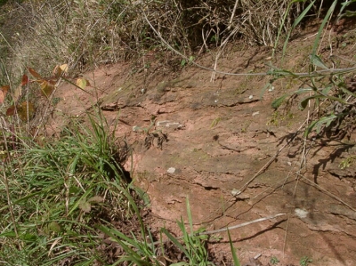 Am Aufschlußpunkt Laubornhof treten Gesteinsschichten aus der Buntsandstein-Zeit zutage. Im Unterschied zu den anderen Buntsandstein-Aufschlußpunkten des Geo-Pfads zeigen sich hier aber nicht nur die bekannten rötlichen Sandstein-Schichten, sondern auch eine weiß-gelblich-braune Gesteinsschicht, in der grobe, eckige Gesteinsbruchstücke aus Dolomitstein stecken. [1]