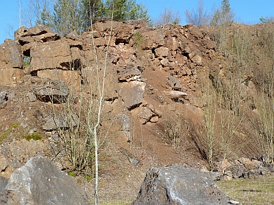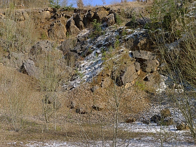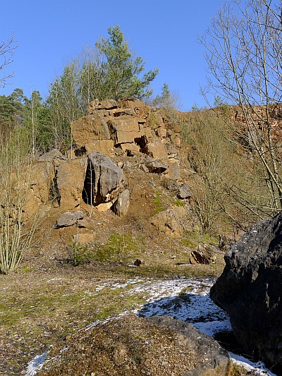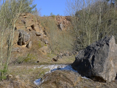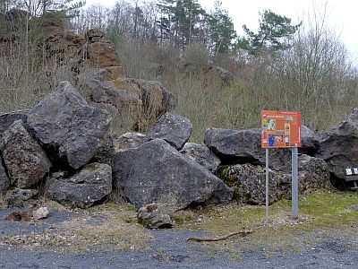 Die Kalkstein-Schichten, die in diesem ehemaligen Steinbruch zu sehen sind, stammen aus der Mitteldevon-Zeit (vor 390 - 376 Mill. Jahren). Sie sind aus Karbonatablagerungen des tropischen Mitteldevon-Meeres entstanden, das sich damals unter anderem auch über den Bereich der Eifel erstreckte. Bei den Kalkstein-Schichten handelt es sich um eine Gesteinswechsellagerung von tonhaltigen, fossilreichen Kalksteinen (mergelige Kalksteine) und tonarmen bis tonfreien Kalksteinen, die reich an Fossilresten von Stromatoporen sind.
