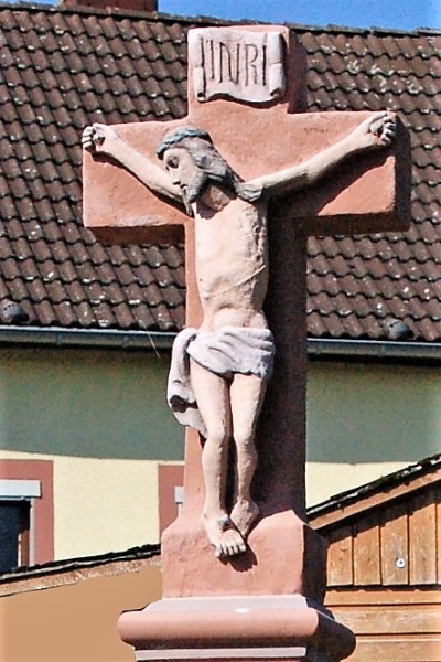 In Osann, am Ortsausgang nach Platten, steht ein Schaftkreuz von 1719. Dort sehen wir Petrus kraftvoll, entschlossen. Das Relief zeigt Petrus in der Zeit nach Christi Himmelfahrt beim Aufbau der Kirche, noch vor dem Auftreten des Paulus.