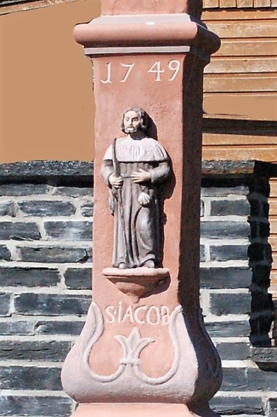 In Plein an der Kirche steht das Jakobuskreuz von 1749 mit dem Relief des Heiligen. Der Apostel aus Betsaida (25. Juli), der ältere der beiden Söhne des Zebedäus, war der erste Jünger Christi, der als Märtyrer starb (um 44). Die Legende erzählt, daß seine Gebeine im 7. Jahrhundert von Jerusalem nach Santiago de Compostela in Nordwestspanien gebracht wurden. Dort wurde er bald zum Volksheiligen. Der Pilgerweg nach Santiago war der Höhepunkt im Leben jedes frommen Menschen des Mittelalters. Noch heute beeindruckt das riesige, am heiligen Ort durch die Luft schwingende Weihrauchfaß, auch wenn der Massentourismus die Kathedrale längst fest im Griff hat. Jakobus selbst wurde zum Symbol des Menschen auf dem Weg zum Heil. Er erhielt die Attribute des Pilgers: Stab, Hut, Trinkmuschel.