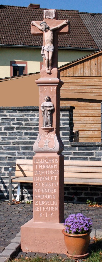 Am 2015 neu hergerichteten Jakobusplatz steht das Jakobuskreuz von 1749 mit dem Relief des Heiligen. Das auf das Jahr 1749 datierte Kreuz, stand einstmals versteckt im Schatten von Bäumen auf einem Grat der Felsrippe zwischen Unkenstein und Felsenburg, der sich vom Grünewald herunter ins Wittlicher Tal erstreckt. Nach dem zweiten Weltkrieg übergab die Familie Becker-Neuerburg das Sandsteinkreuz der Gemeinde Plein und es fand nach gründlicher Restaurierung seinen Platz an der Südwand der Filialkirche St. Jakobus. Das Schaftkreuz ist aus rotem Sandstein, der Schaftfuß auf dem Sockel enthält die Inschrift "Jesu Christ erbarm dich unser in der letzten Stund und erhalt uns zur Seligkeit AMEN-RIP". Der Text lässt auf ein Totengedächtniskreuz schließen. Auf dem nach unten bauchig ausgeweiteten Schaft ist der Apostel und Pilgerheilige Jakobus der Ältere mit dem Pilgerstab, Muschel und Hut dargestellt. Auf der gegliederten Standplatte ist dann das Kruzifix mit Korpus und Inschrift aufgesetzt. [2]