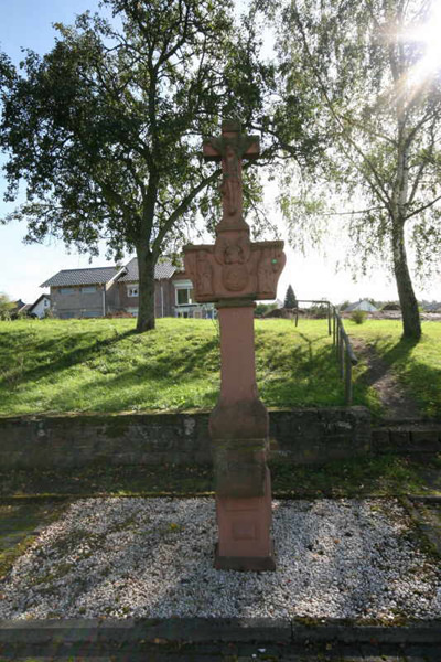 Friedhofskreuz mit den Figuren Jesus, Maria und Johannes. Die Höhe beträgt etwa 3,10 Meter. Es ist in Barockform gestaltet mit einem Altarvorsprung am Schaftfuß. Der Kreuzschaft ist unten bauchig erweitert mit einem Blattrandzierwerk. Durch Eisenklammern ist der Schaft mit dem Schaftfuß zusammengehalten. [...]