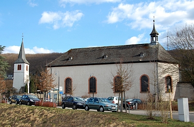 Umbau und Erweiterung der ehemaligen Zehntscheune des Trierer Martinsklosters von 1766 zum Saalbau mit Dachreiter über dem Dreiseitchor, bezeichnet 1834, Architekt königlicher Baukondukteur Simonis; Ausstattung zum Teil aus dem Vorgängerbau, Ausmalung von 1903. [1]