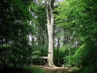 Standort: Bundesstraße 50 von Bitburg nach Luxemburg zur Grenzstation von Vianden, Waldweg 2 Kilometer hangaufwärts bis zur Schutzhütte, 50 Meter links mächtige Traubeneiche, Abteilung 9b [2]