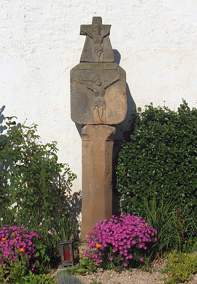 Vor der Hauswand steht ein Nischenkreuz, dessen ungewöhnliche Ausführung und Aufstellung zur Legendenbildung Anlaß gab, doch dürfte der Standort nicht der ursprüngliche sein. Der Schaft ist breit zum achteckigen Querschnitt abgefast, wobei die Fasen am oberen Ende (das untere ist nicht erhalten) mit einer abgesetzten, leicht konkav gerundeten Schräge zum quadratischen Querschnitt übergehen. Das würfelförmige Nischengehäuse sitzt lose auf dem Schaft und ist mit der Nischenöffnung zur Hauswand gedreht, so dass die Rückseite mit einem flach reliefierten Korpus von einem eingeritztem Kreuz sichtbar wird. Der naiv gearbeitete Korpus wiederholt sich in ähnlicher Form an dem pyramidenförmigen, möglicherweise nicht gleichzeitig entstandenen Abschlußkreuz.