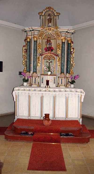 Kleiner, dreiseitig geschlossener Saalbau von 1887, wegen des kleinen Grundstücks straßenparallel angeordnet und deshalb nach Norden ausgerichtet. Außen wie innen noch ganz in barocker Tradition mit zwei Achsen rundbogiger, werksteingefasster Fenster und flacher Segmentbogentonne über ausladendem Gesims. Nur der quadratische Dachreiter über der Giebelseite verrät mit seinem Pyramidendach die späte Entstehungszeit. Vor dem Eingang ein vermutlich jüngerer Windfang. Das recht aufwendige barocke Altarretabel, inschriftlicht bezeichnet 1736, stammt aus der alten Kirche von Rodershausen. [2]