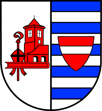 Schild gespalten, vorne in Silber ein rotes Buch mit roter Mitra und roter Krümme, darüber rotes Kirchenmodell; hinten 9-fach von Blau und Silber geteilt, in der Mitte belegt mit rotem Schild, darin ein silberner Balken