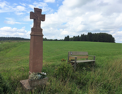 Nördlich des Ortes bei Windhausen, an der Straße nach Langenfeld. Schaftkreuz auf neuem Betonsockel. Die Oberflächen des leicht gebauchten, am unteren und oberen Ende profilierten Schaftes grob scharriert, wohl von einer Renovierung in neuerer Zeit. Das am Fuß 1780 datierte Abschlußkreuz mit einfachem Korpus nicht überarbeitet, aber stark verwittert. [1]