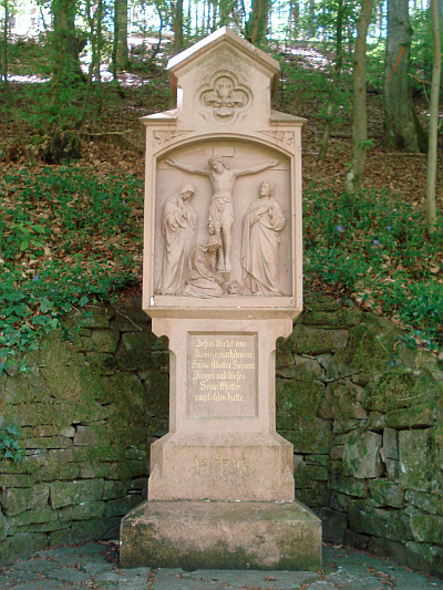 Restauriert 1981. Stationsbilder der sieben Schmerzen Mariens, geschaffen von Bildhauer J. Hess im 19 Jahrhundert, führen zu dieser einsamen Pilgerstätte. [2]
