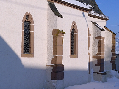 Kleiner Saalbau mit eingezogenem, dreiseitig geschlossenem Chor und massigem Westturm, in der heutigen Erscheinung von der Bautätigkeit um 1500 oder im beginnenden 16. Jahrhundert geprägt. Die unterschiedlichen Fensterformen, teils mit einfachem Maßwerk, teils dreipaßförmig schließend, und die uneinheitlichen, nachträglich erhöhten Strebepfeiler können sowohl auf die Einbeziehung älterer Substanz als auch auf spätere Veränderungen hinweisen. Am ungegliederten Turm nur kleine rundbogige Schallöffnungen und eine stark eingezogener achteckiger Spitzhelm. Im Chor Kreuzrippengewölbe, im Schiff Sternrippengewölbe. Einfache, neugotische Ausstattung, das Altarretabel jetzt im Neubau. [1]