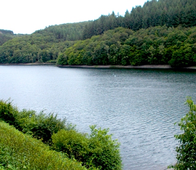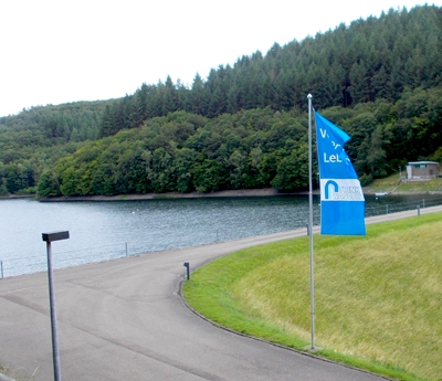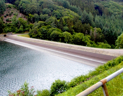 Blick von der nordöstlichen Seite auf die Staumauer und Seitenarm der Riveris-Talsperre. [2]