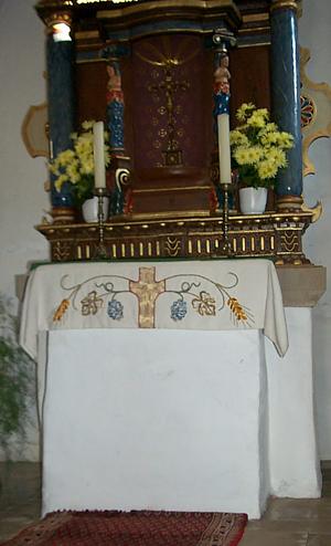 Die Altarplatte des alten Zelebrationsaltars (nicht des neuen nach dem 2. Vatikanischen Konzil eingebauten Zelebrationsaltars direkt davor) ruht auf einem großen, roh behauenen Monolith. Da dieser mit weisser Farbe überstrichen ist, ist seine Oberflächenstrukur leider nicht erkennbar. Aufgrund mehrer Parallelbeispiele der Verwendung von Menhirteilen in christlichen Altären (z. dem 1992 entdeckten in Latsch) und der Nähe zum Ferschweiler Plateau mit seinen vielen Menhiren und anderen vorgeschichtlichen Denkmälern wäre auch hier eine Zweitverwendung eine Menhirs denkbar - wenn auch kaum beweisbar.