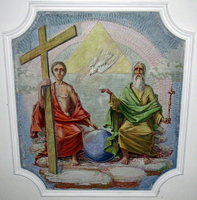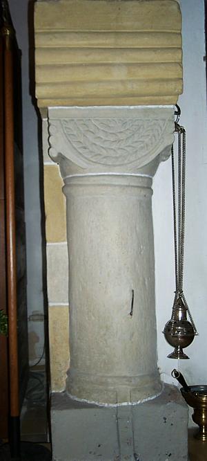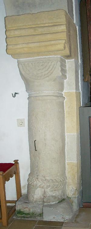 Der Raumeindruck im Inneren wird bestimmt vom wuchtigen romanischen Triumphbogen, in dessen Laibungen halbrunde Pfeiler mit Kapitellen und mächtigen Kämpfersteinen sitzen. Kämpfer, Kapitelle und Basen sind mit Taustäben beziehungsweise wulstigen Rundstäben