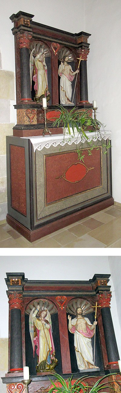 Beachtung verdient auch der von einer hohen Natursteinmauer umgebene intakte Kirchhof. Weil seit 1965 ein neuer Friedhof am Ortsrand belegt wird, befinden sich auf dem alten Kirchhof überwiegend ältere Grabdenkmäler; diejenigen aus der Zeit der Jahrhundertwende sind teilweise von beachtlicher Qualität. [1]