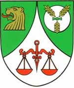 Schild, durch eingeschobene silberne Spitze, darin eine rote Waage, gespalten, vorne in Grün ein rotgezungter abgeschnittener Löwenkopf, hinten in Grün ein silberner Mühlstein mit drei goldenen Ähren belegt.