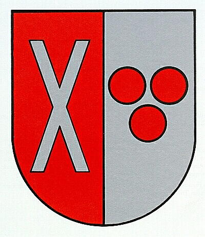 Schild Rot und Weiß gespalten, vorne ein weißes Andreaskreuz, hinten 2 (2:1) rote Kugeln. (Weiß = Silber).