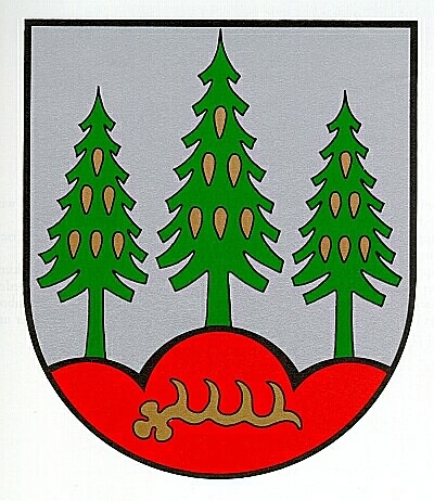 In Silber auf rotem Dreiberg, darin eine goldene Hirschstange, drei grüne Fichten mit goldenen Zapfen.