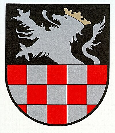 Schild geteilt, oben in Schwarz ein goldbekrönter und goldbewehrter silberner wachsender Löwe, unten silber-rot geschacht.