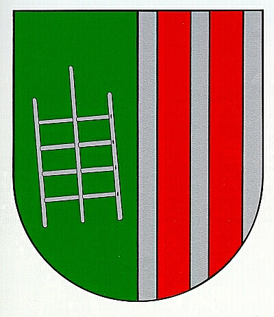 Schild gespalten, vorn in Grün silberner Rost, hinten in Silber zwei rote Pfähle.