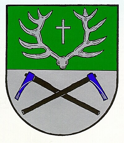 Von Grün und Silber geteilt. In Grün ein 12endiges, silbernes Hirschgeweih mit Grind, einschließend ein silbernes Kreuz, in Silber 2 schragenförmig gekreuzte blaue Rodehacken mit schwarzen Stielen.