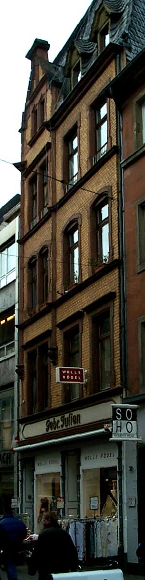 Die asymmetrische, horizontal geschichtete und sandsteingegliederte Klinkerfassade der späten Neugotik gibt sich als typischer Vertreter jener Variante des spätesten Historismus zu erkennen, die noch in der Tradition des Geschäfts- und Mietshausbaus der 1890er Jahre steht. Dominante bildet der durch fialenartige Bauglieder abgesetzte und durch einen Zwerchhausgiebel überhöhte, linke Fassadenabschnitt. Er ist als Reduktionsform eines Seitenrisalits zu verstehen. Unverändert erhalten ist die vom Oberbau unabhängige Gliederung des Ladenparterres mit zeittypischen, gußeisernen Pilastern. Sie flankieren den an den linken Fassadenrand gerückten Wohnungseingang und den zwischen zwei großen Schaufenstern angelegten Ladeneingang. [1]