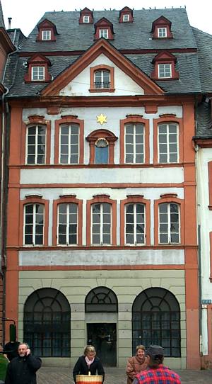 Das von einem hohem Mansarddach übergriffene Traufenhaus hebt sich durch seinen reich gegliederten, dreigeschossigen und mit einem Frontispiz ausgestatteten Wandaufbau von dem städtischen, üblicherweise nur zweigeschossigen Wohnhausbau des Barock ab. Ursprünglich steinsichtig, ist sie heute verputzt. Charakteristisch die spiegelsymmetrische Anlage und die dichte Sandsteingliederung. Rundbögen im gebänderten Erdgeschoss, Schulterbögen mit Scheitelsteinen in den Obergeschossen. Im zweiten Stock dient eine mittlere Ädikulanische als Blickfang (darin die Kopie einer gotischen Madonna). Die drei mittleren Achsen übergreift ein dreieckiger, befensterter Frontispiz mit einer dem verkröpften Traufengesims angepaßter Rahmenprofilierung.
