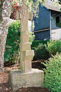 Torso eines Schaftkreuzes mit einer Abstellkonsole. Auf dem Sockel ist die Inschrift zu lesen : ANNO 1812 HOCHWERHER GIRRAPETZ. Nach alten Unterlagen war auf einem Teil des Kreuzes auch ein Kelch mit Hostie dargestellt. Das Kreuz erinnert an einen Priester: offensichtlich an den Frühmesser Gerhard Pütz, der nach Oster (Geschichte der Pfarreien) 1794 tot zwischen Pronsfeld und Lünebach gefunden wurde.