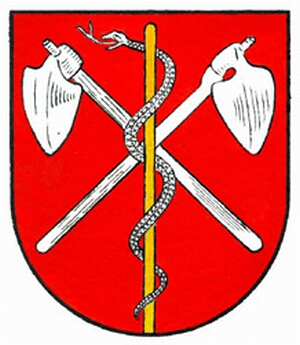 In Rot zwei schragenförmig gekreuzte silberne Rodehacken, belegt pfahlweise mit goldenem Äsculapstab mit silberner Schlange.