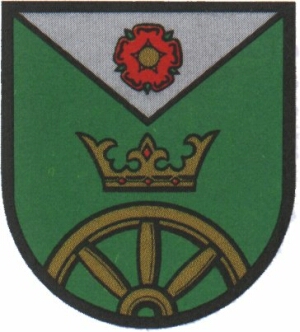 Unter gestürzter und. gekürzter silberner Spitze, darin eine rote Rose mit goldenem Samen und grünen Kelchblättern, in Grün ein oberhalbes, aus dem unteren Schildrand kommendes goldenes Rad, überhöht von einer goldenen Krone.